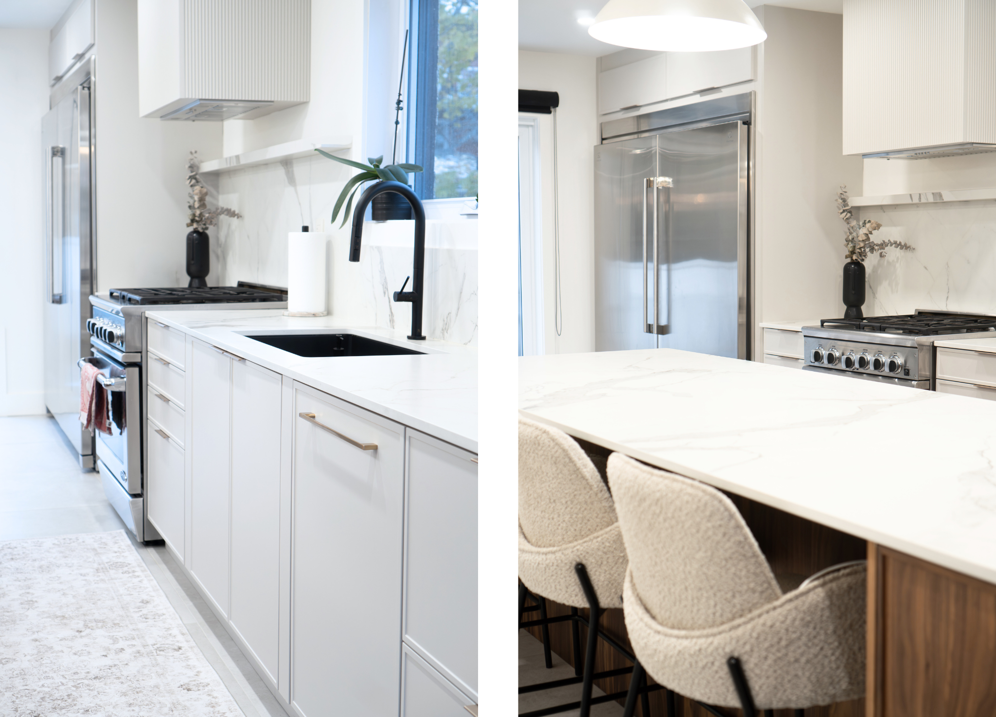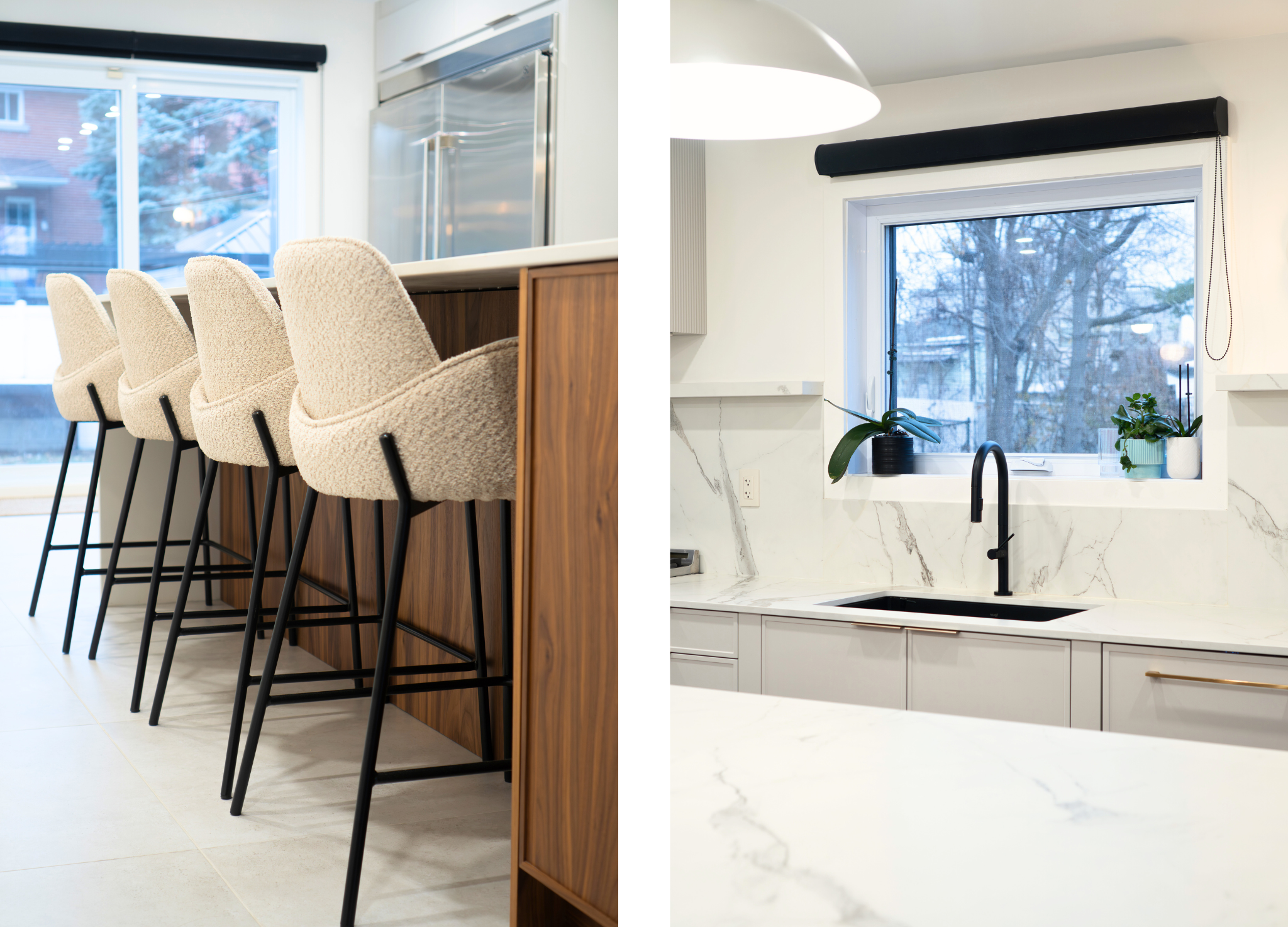 The du Havre Project strikes a balance between the understated simplicity of light-toned polymer cabinetry and the warmth of walnut, Satin finish. Clean lines, a stone countertop with delicate veining, and integrated appliances create a cohesive, bright, and functional space. A custom-designed kitchen built to last, where beauty and practicality meet precision.
