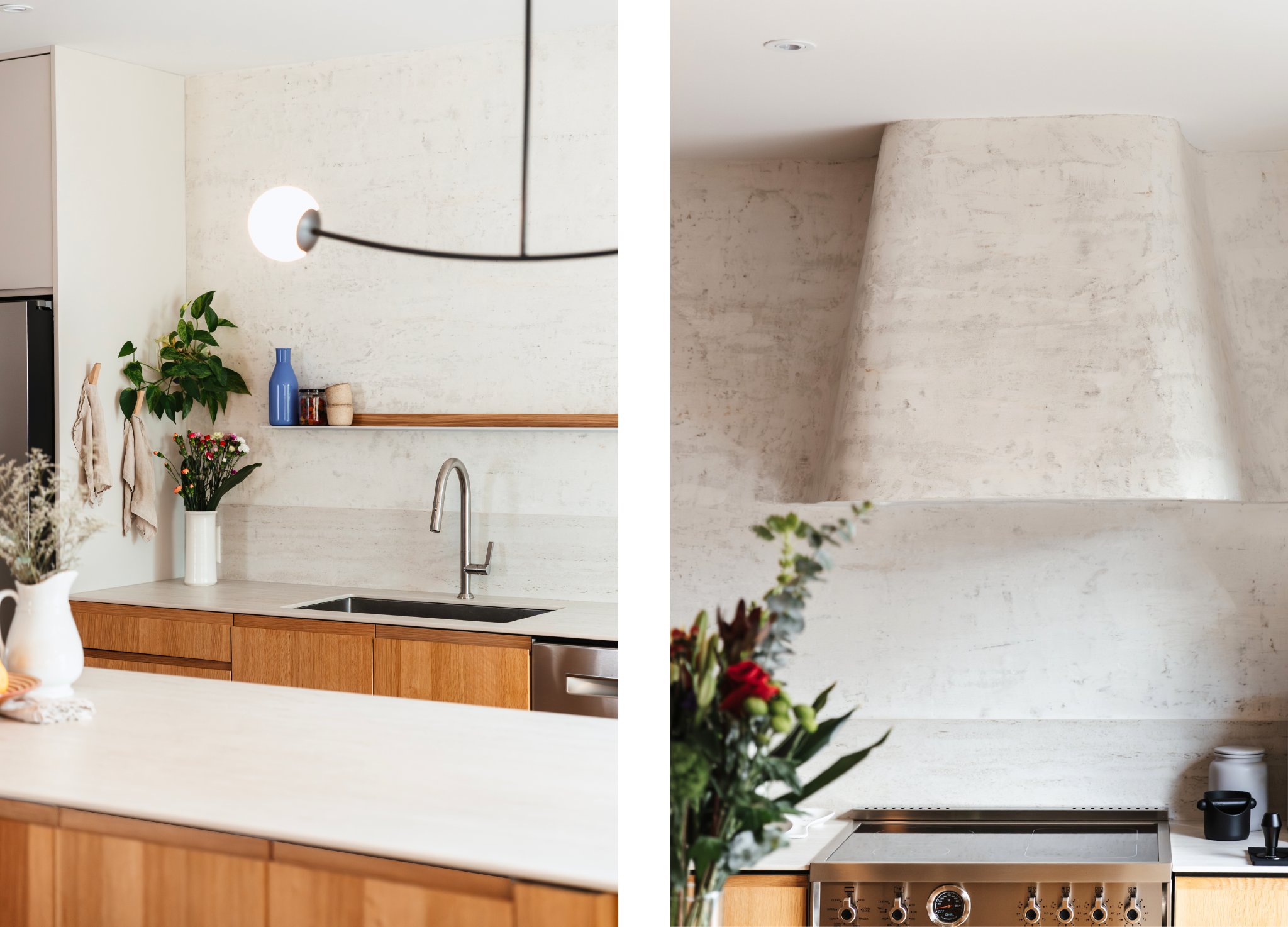 One of the standout features is the custom-built range hood, which acts like a sculptural centerpiece. Its fluid, subtle shape blends seamlessly into the architecture, adding handcrafted quality that feels both intentional and understated. It sets the tone for the rest of the space: thoughtful, precise, and quietly unique. What makes this project special is its ability to merge diverse influences into a harmonious whole. There's a quiet sense of travel, warmth, and story woven into the textures and palette.