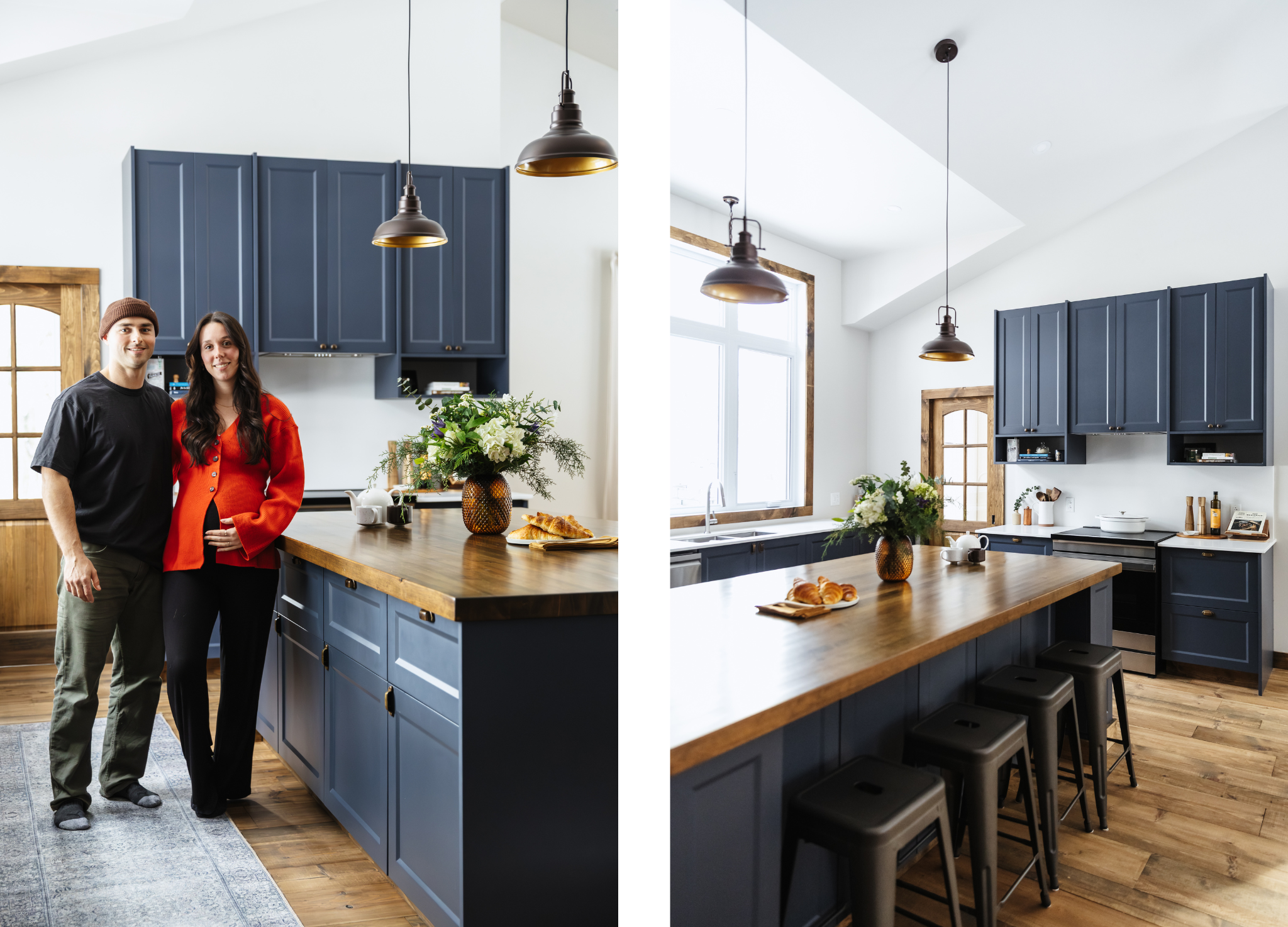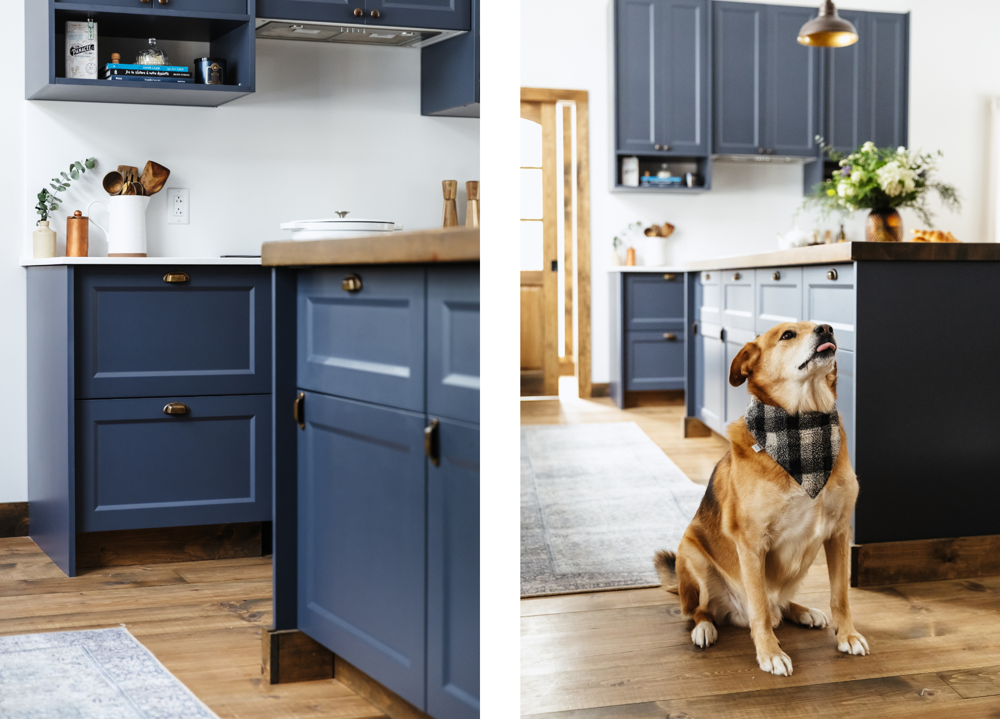 Wood accents play a key role in warming the design. Carefully selected wood details, custom open niches, and a generous wooden island introduce texture and contrast, grounding the space and creating a natural focal point. Both functional and elegant, the island anchors the kitchen and invites everyday moments of gathering. No wonder their gorgeous dog is named Woodz!