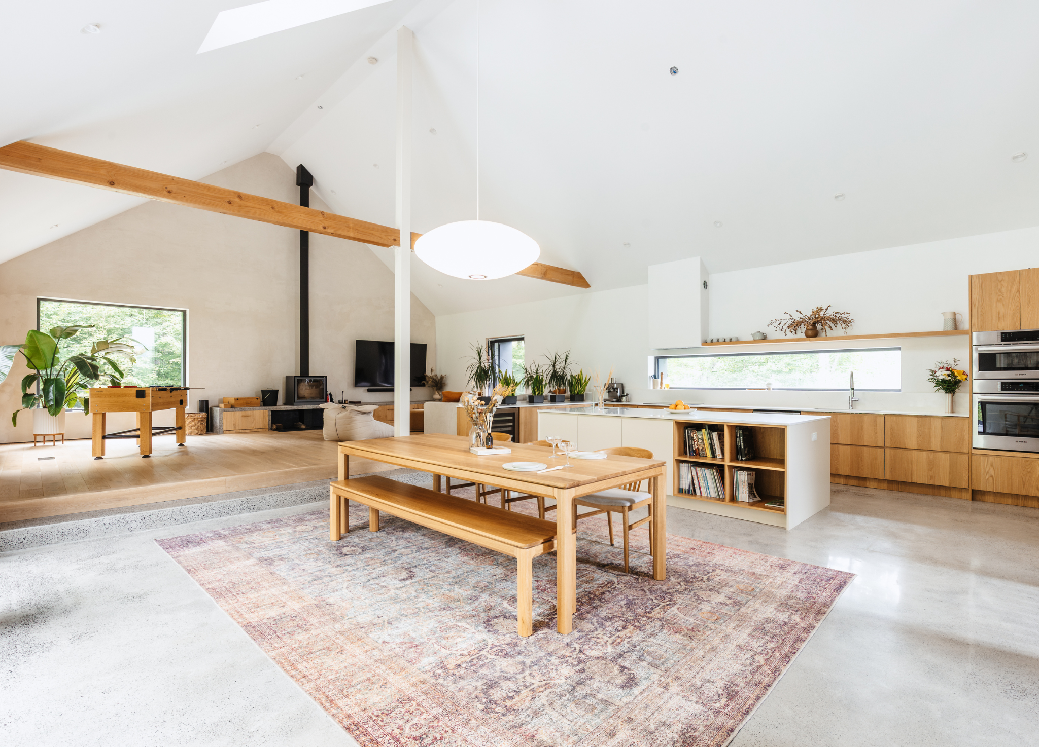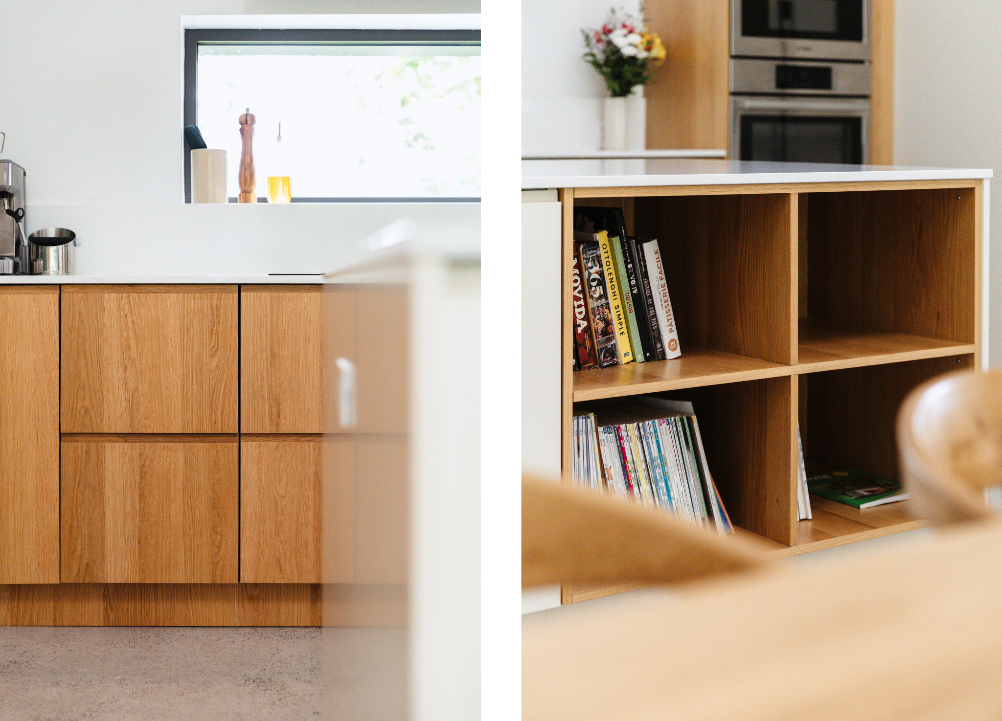 But step inside, and the magic lies in the details. The kitchen, always the heart of the home, is finished with Bo Grip and Slab in White Oak (Plain Cut) with a Satin finish, paired with fronts in a custom Benjamin Moore shade (OC-9 Ballet White). Together, they create a warm yet minimalist palette that flows seamlessly into the white oak detailing found throughout the interiors.