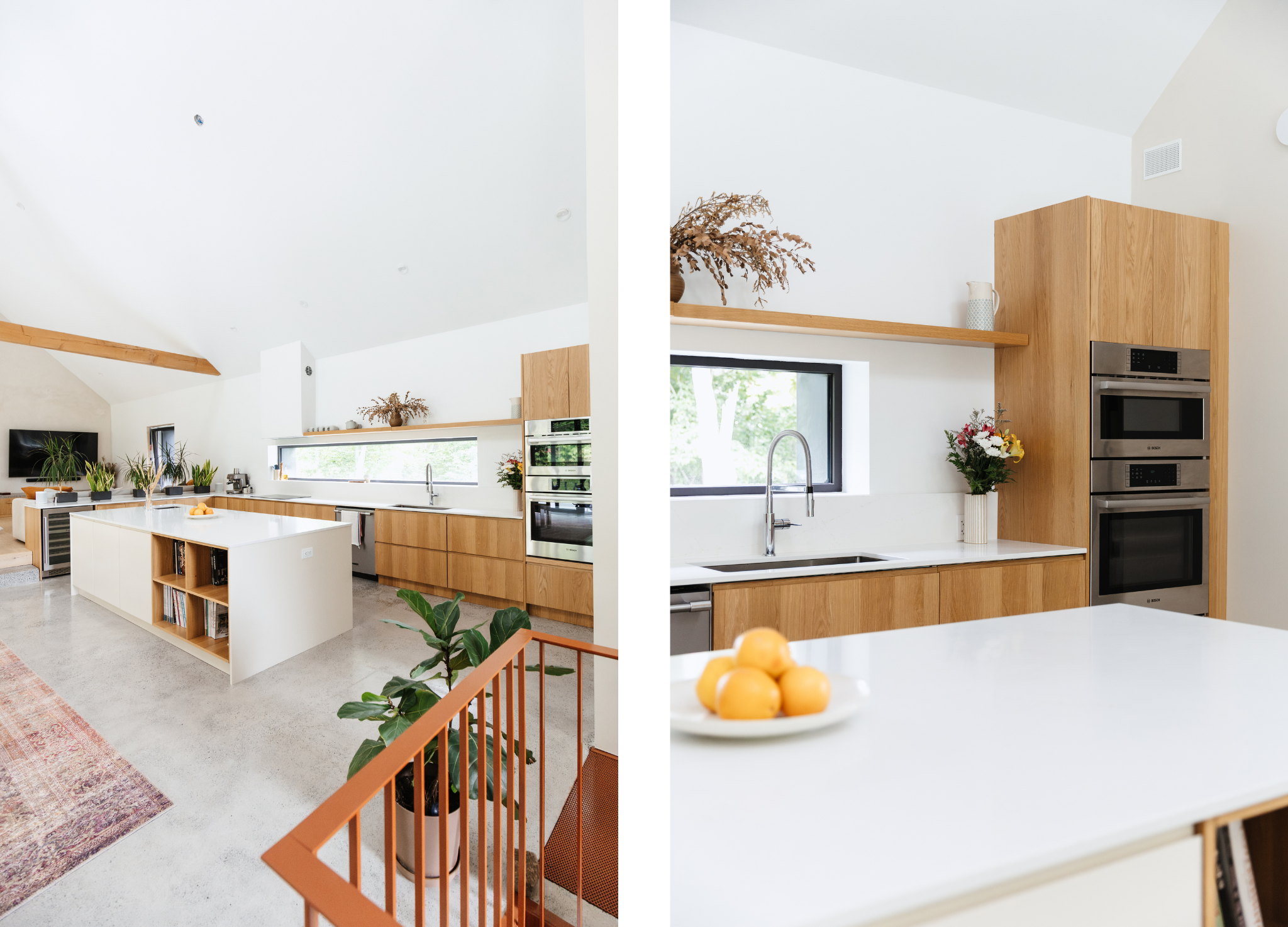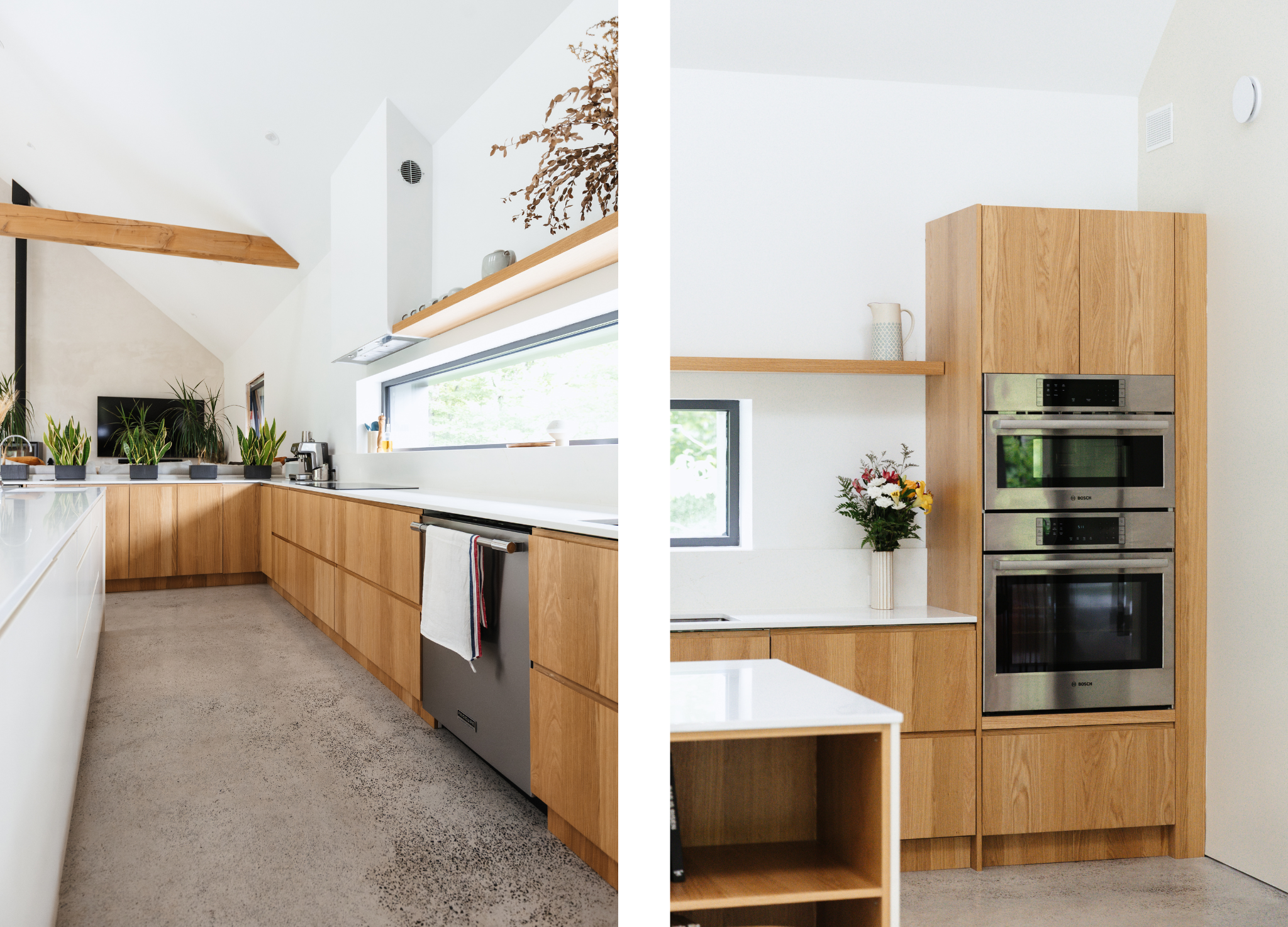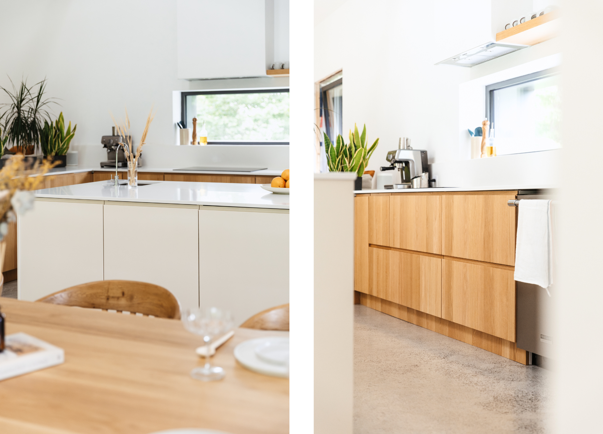 But step inside, and the magic lies in the details. The kitchen, always the heart of the home, is finished with Bo Grip and Slab in White Oak (Plain Cut) with a Satin finish, paired with fronts in a custom Benjamin Moore shade (OC-9 Ballet White). Together, they create a warm yet minimalist palette that flows seamlessly into the white oak detailing found throughout the interiors.