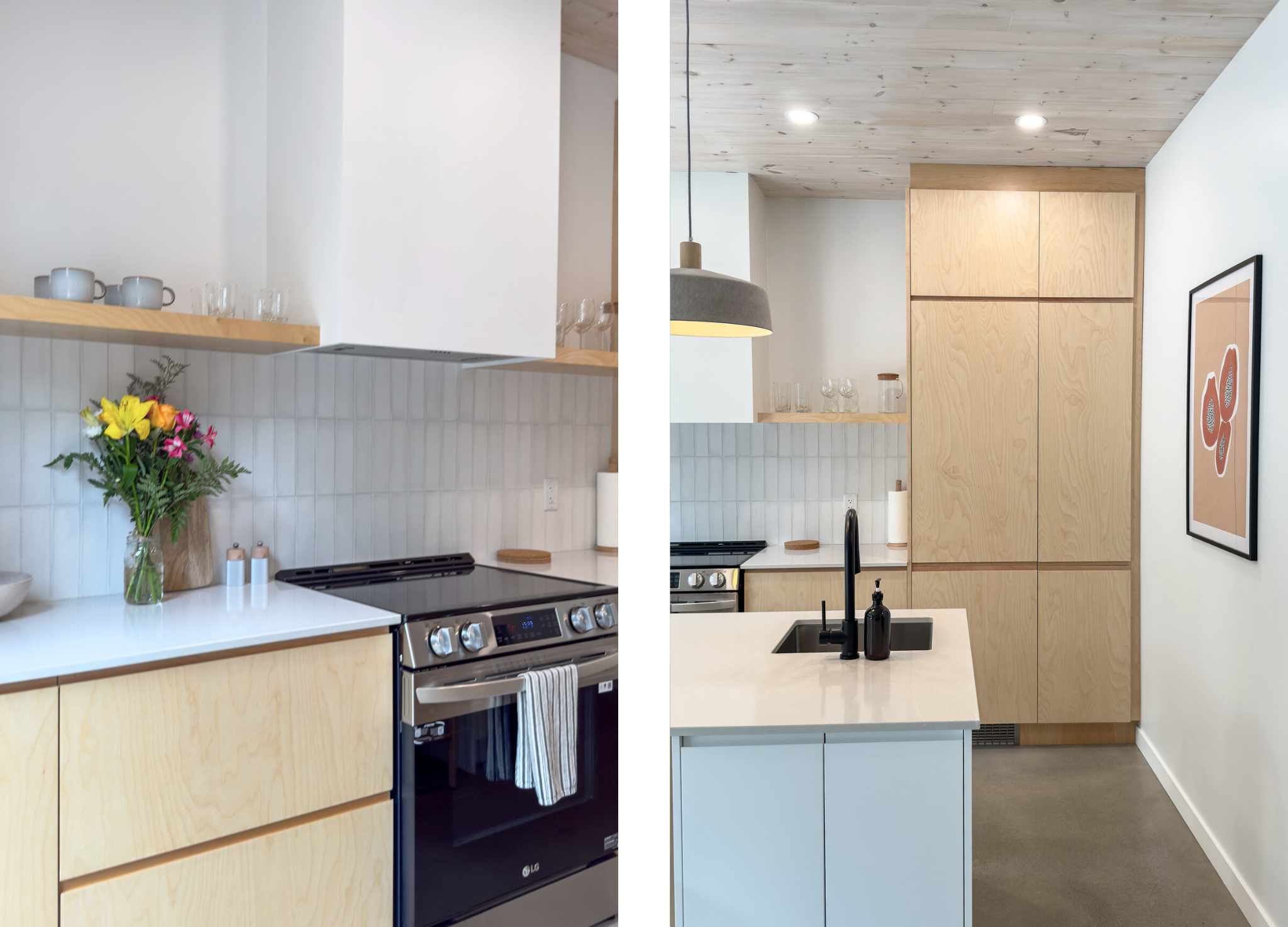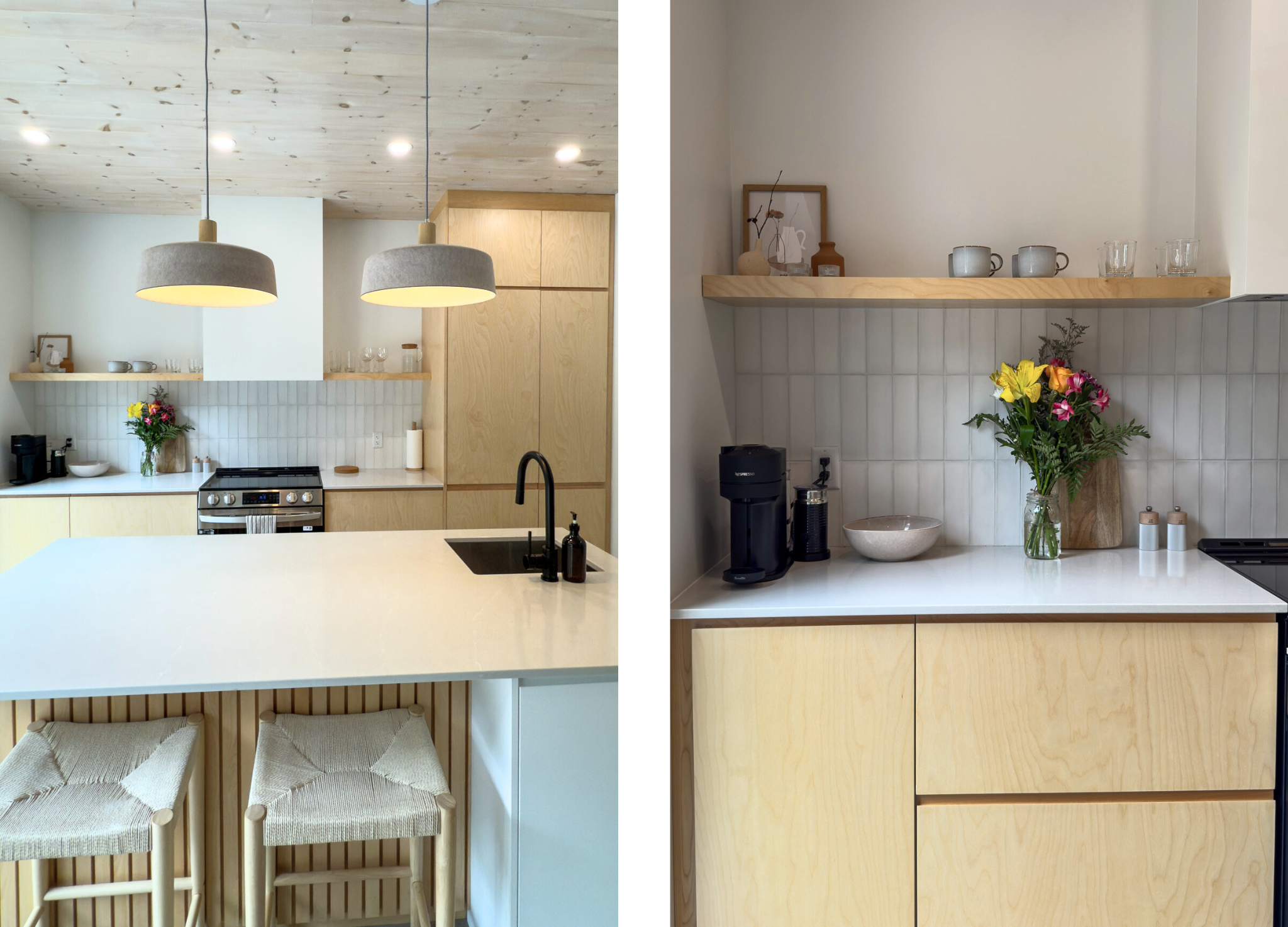 A contemporary kitchen where satin-finished Grip birch wood and soft light-toned surfaces come together to create a warm, bright, and elegantly refined space.