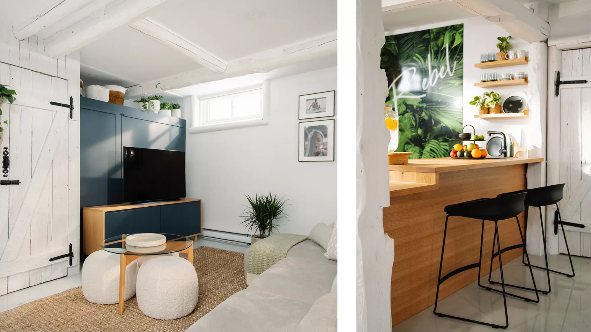 The interior designer selected a dominance of custom white oak panels to add a touch of warmth to this tropical-looking basement.
