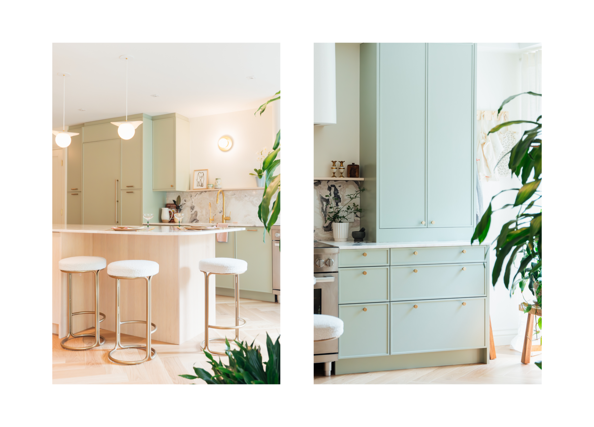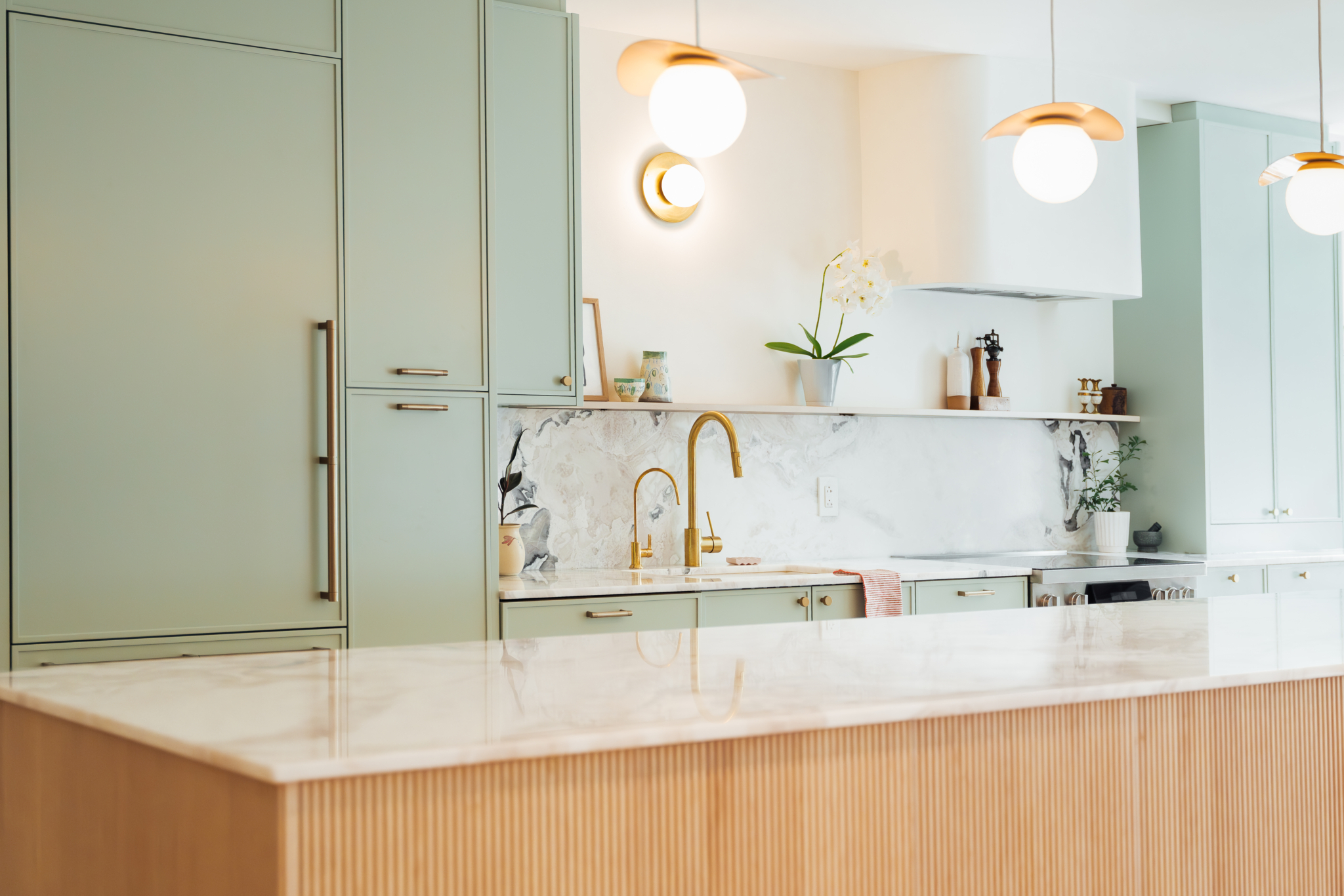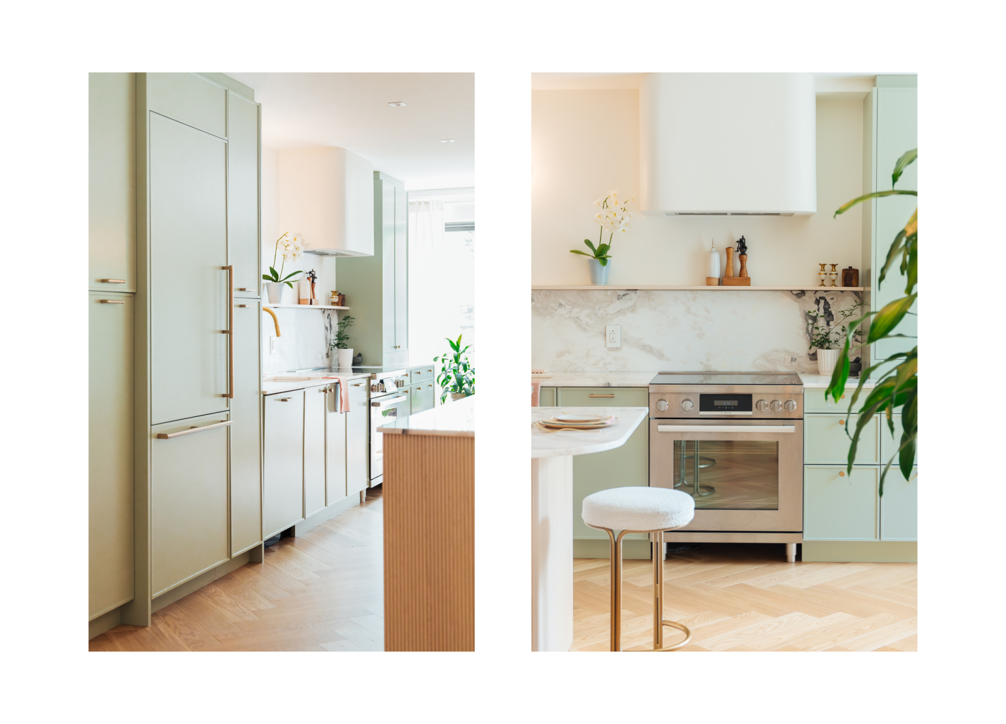 For the design of this kitchen, the choice of green (CC-550 October Miste) for the cabinets was carefully considered to perfectly complement the gold fixtures and handles. This combination creates an elegant and refined contrast. Additionally, the slim door design, with its sleek lines and subtle relief, adds an extra dimension that enhances the kitchen's character.