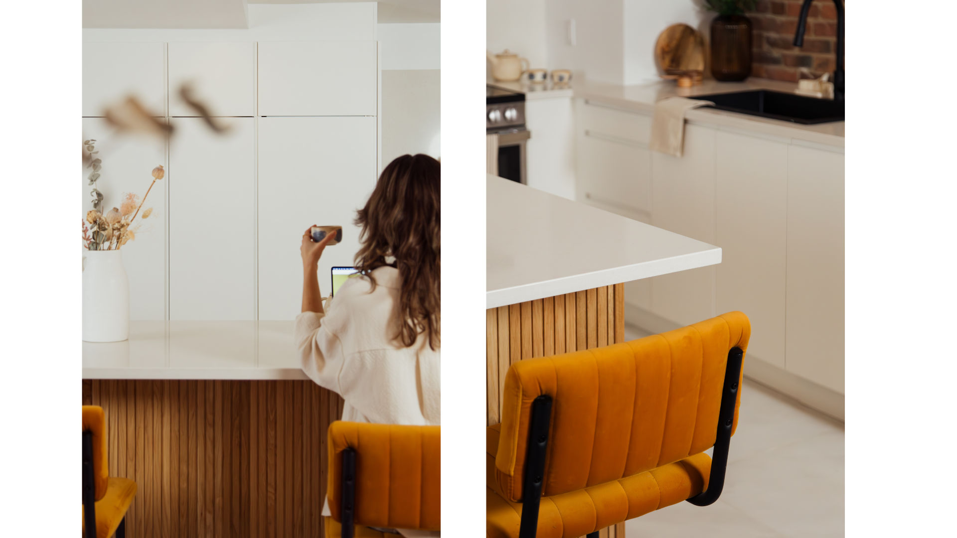 The wall section: To achieve a minimalist effect, the chosen color for the rest of the kitchen is a warm white by Benjamin Moore.