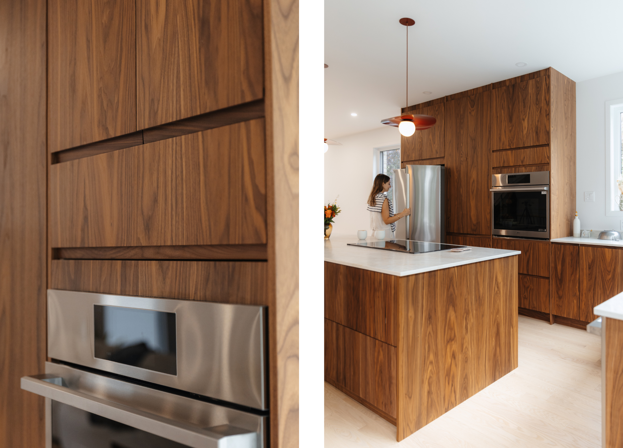 Chez eux, Olivier et Stéphanie savaient qu’ils voulaient une cuisine avec façades « grain matched » dans notre magnifique Noyer, pour un rendu intemporel et parfaitement harmonieux. Découvrez comment le bois se déploie naturellement sur leurs armoires : élégant, cohérent et d’un raffinement sans effort.