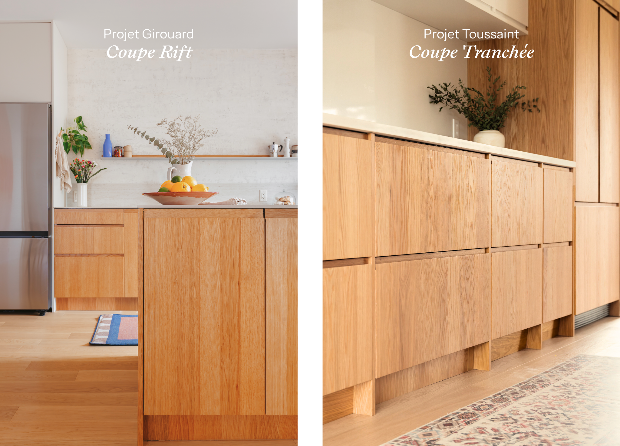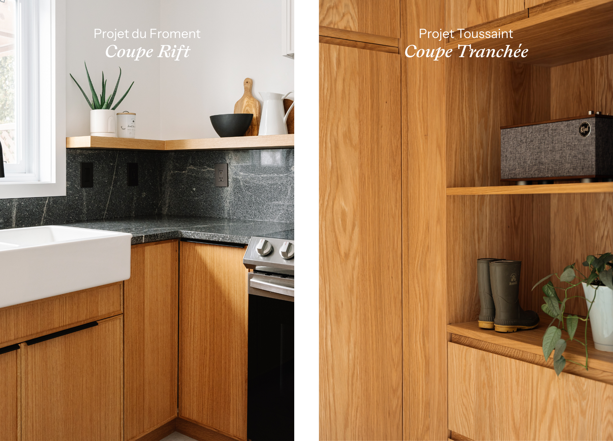 La coupe Rift conviendra à ceux qui privilégient un style moderne, discret et linéaire, tandis que la coupe Tranchée séduira ceux qui aiment un rendu naturel, chaleureux et texturé. Dans les deux cas, on peut observer certaines variations propres au bois, qui ajoutent du caractère et rendent chaque projet unique. Pour un rendu plus haut de gamme et harmonieux, le grain peut également être agencé (“grain match”) dans les deux types de coupe. Ainsi, vous profitez de la durabilité et de la noblesse du chêne blanc, avec une personnalité différente selon la coupe choisie.