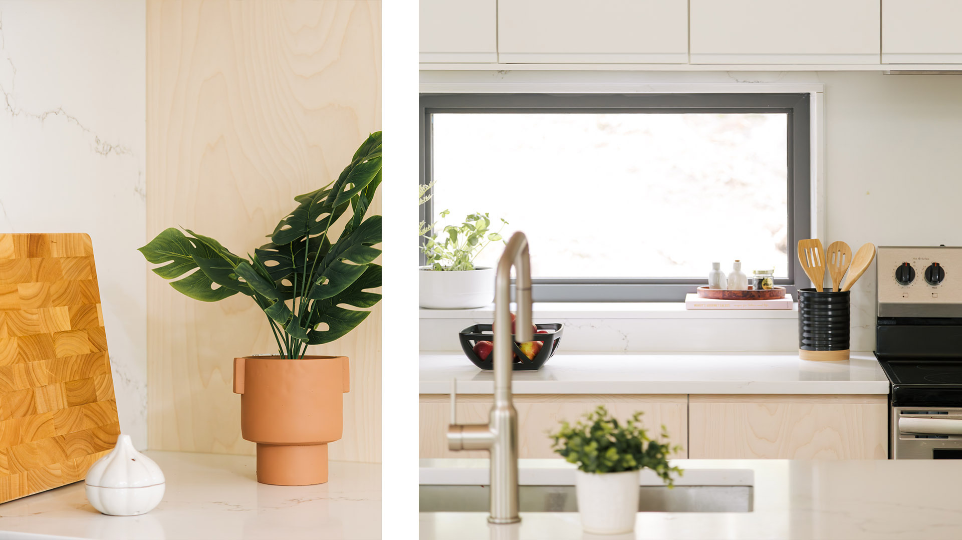 Cette cuisine moderne met de l'avant une finition chaleureuse en bois, ainsi qu'une section de façades blanches pour ajouter de l'éclat à la pièce.