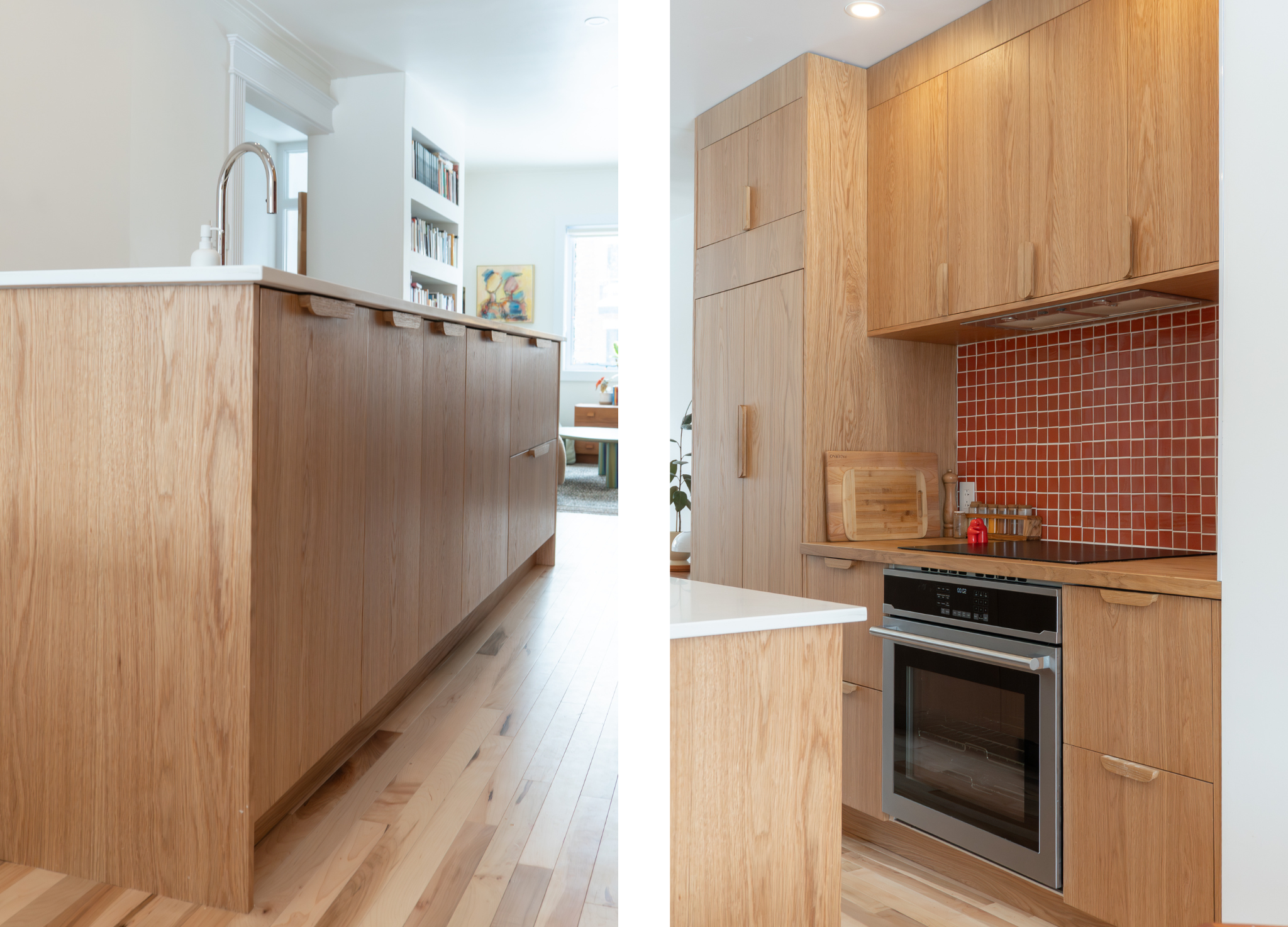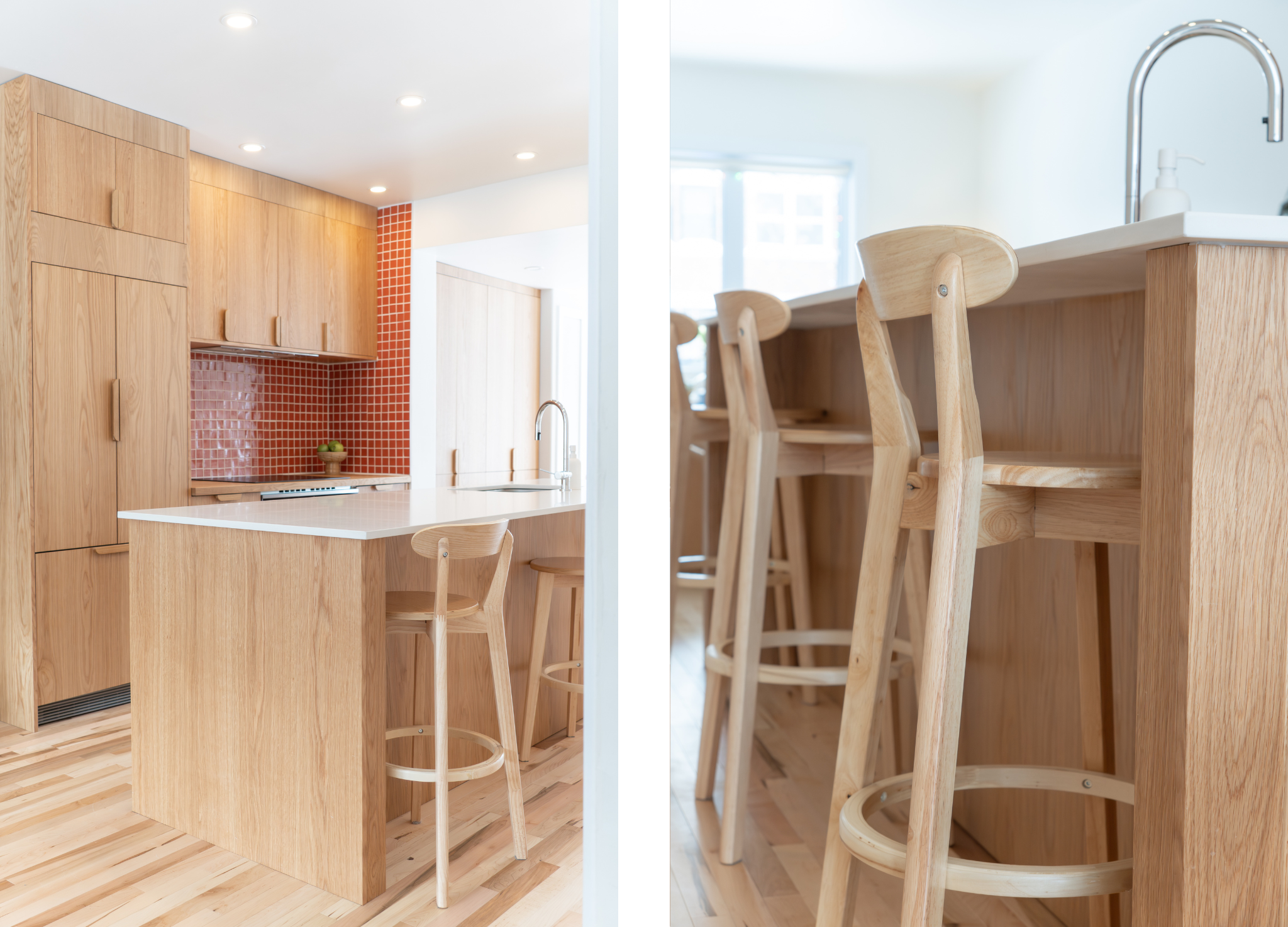 Dans la cuisine du Projet 15e Avenue, le design Slab laisse toute la place à l'expression du chêne blanc au fini Satin. La coupe Tranchée de bois souligne la richesse du grain tout en conservant une lecture sobre et fluide des volumes. Les façades sans artifice renforcent l'impression de continuité et de calme visuel. L'aménagement favorise une circulation naturelle et une utilisation intuitive au quotidien. L'ensemble crée un espace chaleureux, contemporain et résolument intemporel.