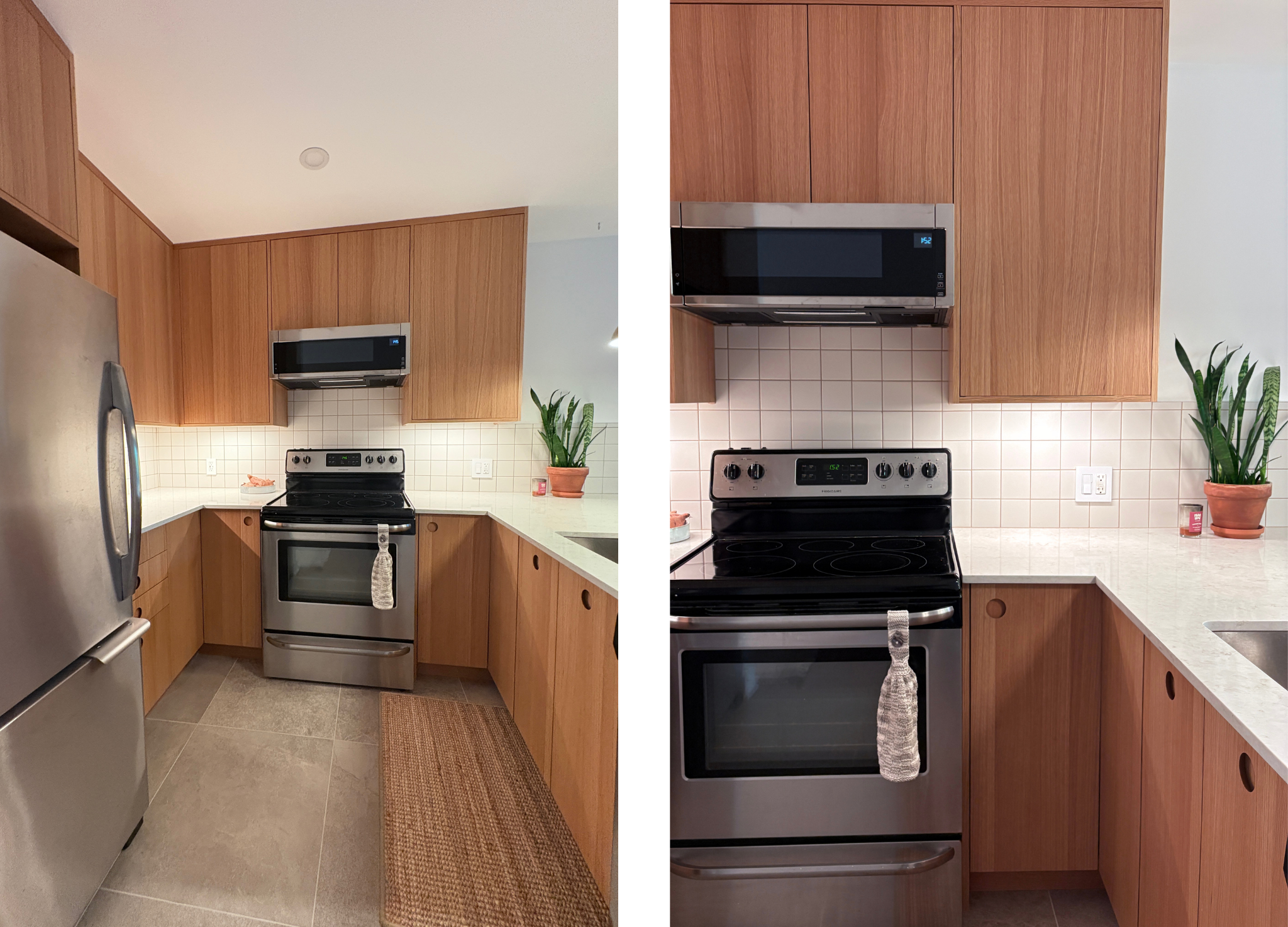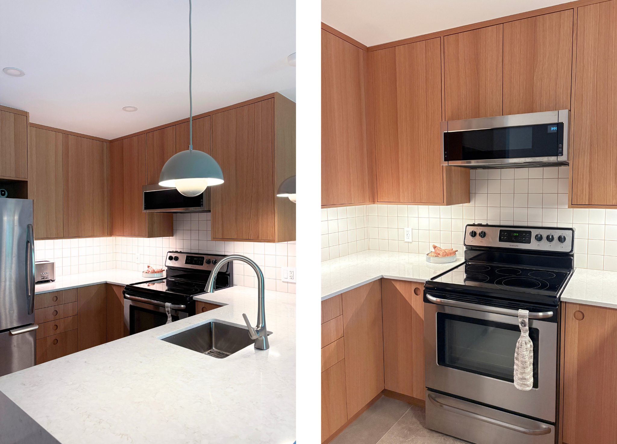 Le projet Augustin-Cantin met en valeur la pureté du chêne blanc à coupe Rift, dont le grain droit et régulier s'harmonie avec les façades Slab et Rond. La texture naturelle du bois contraste subtilement avec la douceur des surfaces lisses, créant un ensemble à la fois moderne, équilibré et chaleureux.