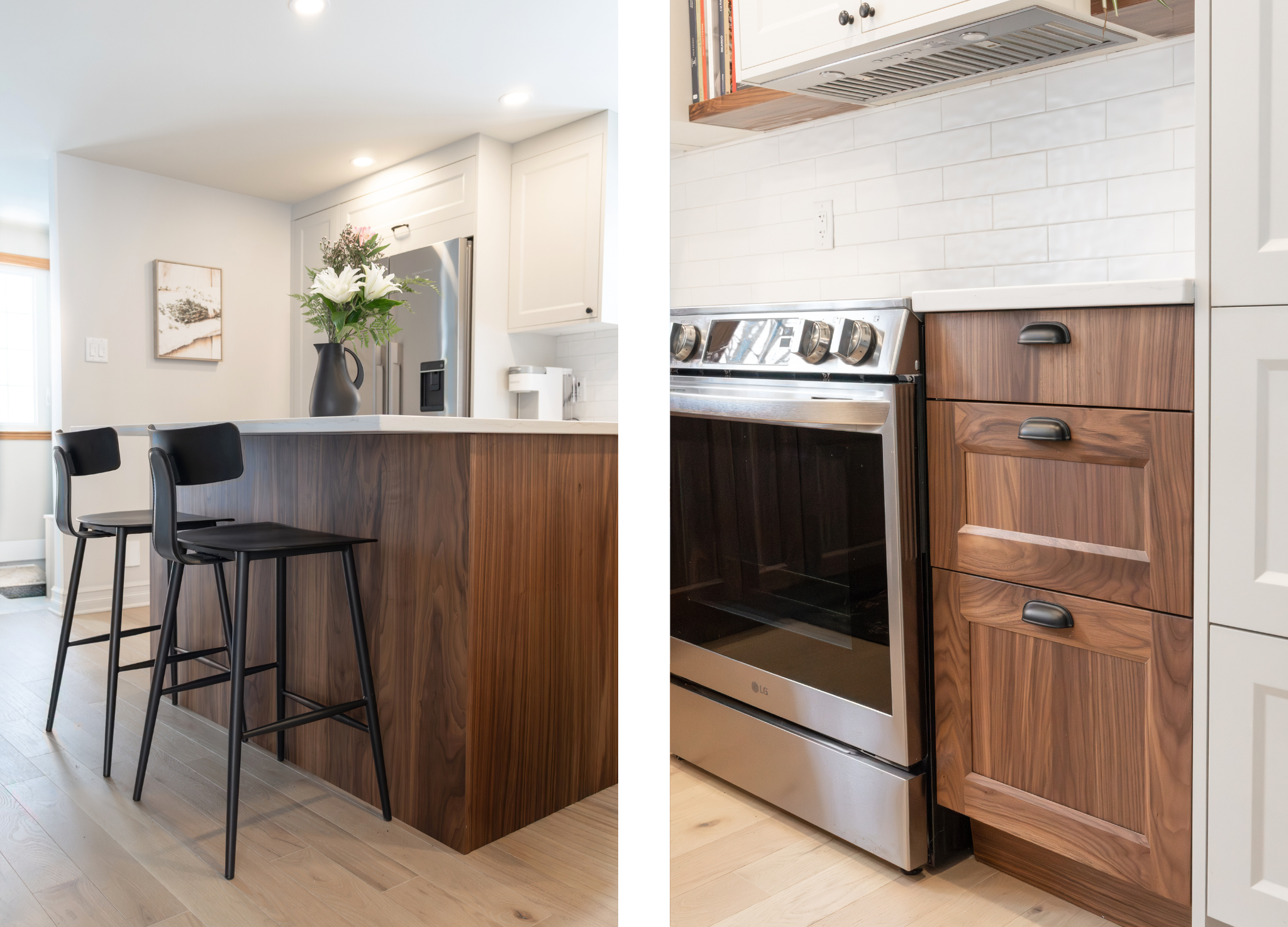Dans la cuisine du Projet Beau-Rivage, le design Traditionnel se modernise par une approche épurée et fonctionnelle. Les armoires en laque, couleur crème naturelle (OC-14), offrent une luminosité naturelle, tandis que le Noyer, finition Satin, ajoute profondeur et chaleur à l'espace. Les poignées discrètes et bien intégrées assurent une lecteur fluide du mobilier sans alourdir les lignes. L'intégration possible des électroménagers permet de préserver l'harmonie visuelle et de mettre en valeur les matériaux. Le résultat est une cuisine équilibrée, élégante et résolument intemporelle.