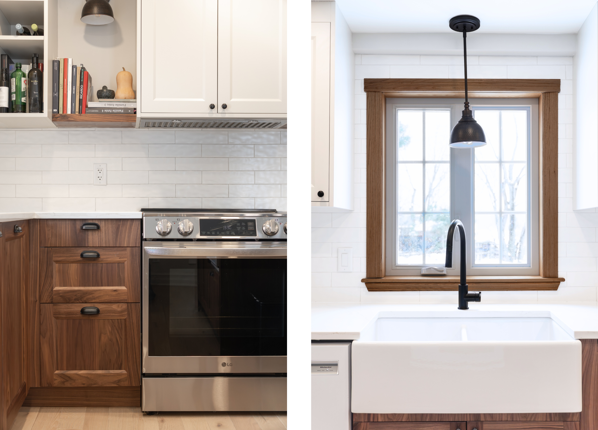 Une cuisine traditionnelle revisitée, où le noyer satiné apporte chaleur et caractère à un palette claire et lumineuse