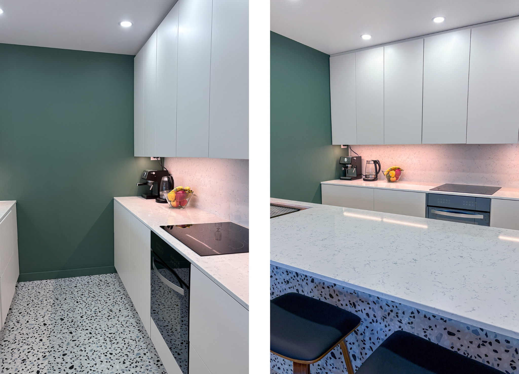 Pour préserver l'esthétique minimaliste, des poignées intégrées ont été privilégiées, assurant une continuité visuelle sans rupture. Les électroménagers encastrés complètent le tout en se fondant discrètement dans l'aménagement, renforçant l'impression d'un espace ordonné, sobre et fonctionnel.