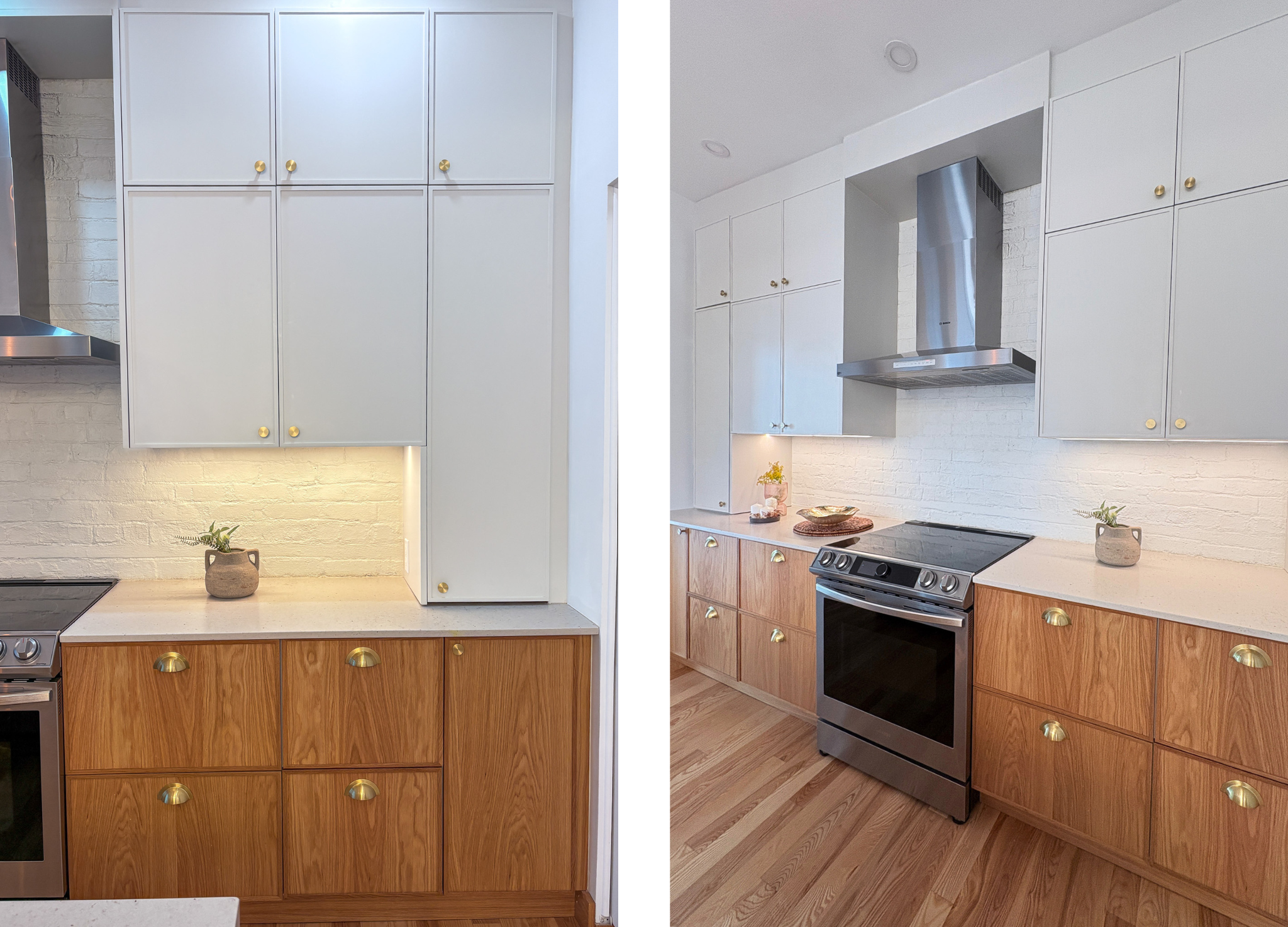 Une cuisine contemporaine d'une élégance intemporelle, où le chêne naturel, les accents de laiton et les nuances douces se conjuguent dans une composition à la fois sophistiquée, lumineuse et chaleureuse.