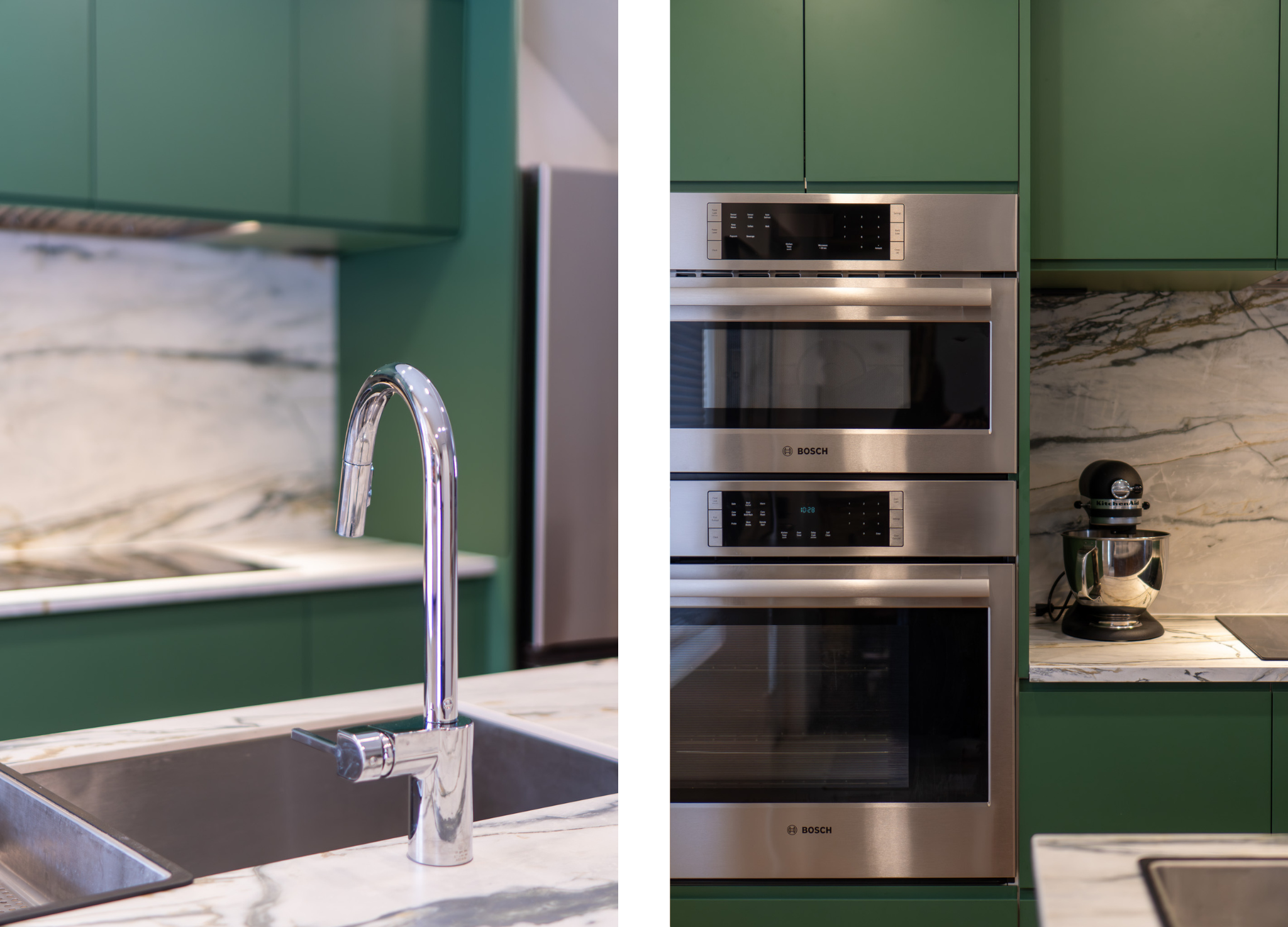 Une cuisine contemporaine et raffinée où la chaleur du noyer s'harmonise avec des façades en laque verte et des surfaces minérales lumineuses, créant un équilibre parfait entre élégance, fonctionnalité et intemporalité.